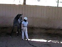 Die letzten Zweifel, ob sich der weite Weg gelohnt hatte wurden mir durch die nächste Erfahrung genommen. Atemlos beobachtete ich wie Monty ein Pferd an gefährliche Stimuli, z.B. raschelnde Plastiktüten gewöhnt. Ich hätte es nicht für möglich gehalten, hätte ich es nicht mit eigenen Augen gesehen. Anfänglich geriet das Pferd beim Anblick der an einem langen Stock befestigten Plastiktüten in Panik. Maximal 30 Minuten später reagierte es mit Gleichmut auf die auf seinen Rücken knisternden Tüten.
