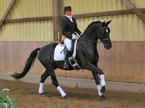 WAR AND PEACE, Rappe, geb. 2000, v. Weltmeyer a.d. Malve v. Matcho AA u.d. Wanina v. Wuemmstern. Der Glanzrappe, bestens herausgebracht zeigte sich von seiner positive Seite. Sehr gutes Vorderpferd mit viel Aufsatz, gutem Rücken, wenngleich die Kruppe etwas linear war. Unter dem Sattel zeigte der Hengst ansprechende Bewegungen welche jeweils mit der Wertnote 7,5 bewertet wurden. Vielleicht könnte der Hengst noch energischer im Hinterbein hebeln. Im Jahre 2004, Sieger der Coupe de Belgique sowie 3.Platz im belgischen sowie französischen Dressur – Championnat. |