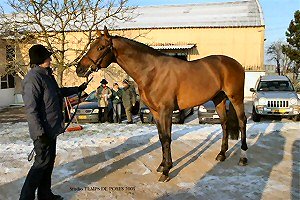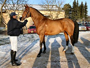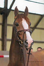 SAMPRAS, Dbr. geb. 1994, v. Sandrissimo a.d. Persika v. Perfekt u.d. Gudrun v. Gotthard. Ein modern aufgemachter Hengst mit gutem Typ, guter Oberlinie, und gutem Bewegungs- ablauf, wobei insbesondere der Galopp hervorstach. Vielleicht wünschte man sich auch etwas mehr Geschlossenheit in der Hinterhand. Guter Rückengebrauch, gutes Vermögen, wenn-gleich man sich ein besseres Oeffnen der Hinterhand über dem Sprung gewünscht hätte. Der Hengst hätte vielleicht etwas aktiver vorgestellt werden. Nichtsdestotrotz hat der Hengst neben dem französischen Meistertitel 2004 in Hunter-Prüfungen insgesamt 15 Siege in Hunter – Prüfungen aufzuweisen. |