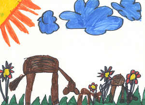 „Nun“, sagte Adam: “ Du hast so viel geschaffen, aber uns fehlt etwas, dass wir sowohl beim Ackerbau, als auch als Fortbewegungsmittel benutzen können. Es sollte kräftig sein, dass es einen Pflug ziehen kann, es sollte schnell sein, dass es mich geschwind von einem Ort zum anderen bringen kann. Es sollte genügsam sein und vor allem nicht so doof wie ein Esel, Kannst Du so etwas schaffen?“