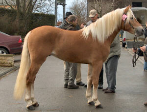 Bei der anschließenden Reihung ging der Sieg an den knapp dreijährigen Junghengst Alvarez (Foto rechts) im Besitz der Liliane Hoffmann Lucas aus Dudelange, der mit Gesamtnote 7,71 die Richter am besten überzeugen konnte. Alvarez ist ein Sohn des aus Südtiroler Zucht stammenden Aaron B nach Antinor, die Mutter Odessa ist eine Angelo Tochter. Dieser Hengst wurde im Oktober 2006 in München Riem auf der süddeutschen Körung gekört und zum Siegerhengst in Reinzucht ernannt. Er überzeugte durch viel Rassetyp, durchaus harmonischem Körperbau und viel Bewegungspotential.