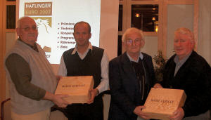 Die Anwesenheit der Südtiroler Delegation nutzte Zuchtleiter Ed Biot auch dazu, über die anstehende Euro Haflinger 2007 in Meran / Südtirol / Italien zu informieren. So fand im Anschluss an die Körung eine Züchterversammlung statt und Michael Gruber, Geschäftsführer des Südtiroler Haflinger Pferdezuchtverbandes und Sekretär des Europaverbandes berichtete ausführlich über die anstehende Schau. Die Bemühungen, das Haflingerpferd auch in seiner Verwendung zu zeigen und die Schau nicht nur auf eine morphologische Bewertung zu beschränken, kam gut an, wenn auch einigen Züchtern die Präsentation in den Schwerpunkten Dressur und Fahren Sorge macht. Hier konnte Michael Gruber beruhigen: wer Pferde ausstellen möchte, die weder gut geritten noch gut gefahren sind, der hat die Möglichkeit, sie für die Schwerpunkte Typ oder Springen einzuschreiben. Im ersten Falle wird neben der Vorstellung im Dreieck ein Freilauf abverlangt, im zweiten Fall einige Freisprünge. Zwei Schwerpunkte also, die vor allem den traditionelleren Züchtern mit schönen Pferden zugute kommen werden.