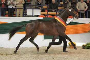 Reservesieger Ettinger v. Connery-Benz wurde von Karl-Heinz Schulenburg aus Schleswig-Holstein für 60.000 Euro gekauft. Der bewegungsstarke Fuchs bezieht aber seine Box im Brandenburgischen Haupt und Landgestüt in Neustadt/Dosse und befindet sich so in den besten Händen schließlich macht das Gestüt seit Jahren mit seinen Produkten auf Turnier- und Championatsplätzen Furore.