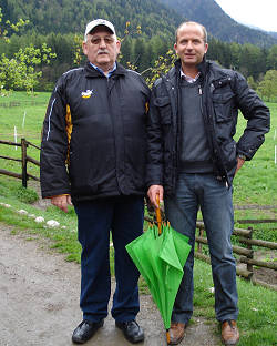 | Michael Gruber rechts im Bild Schriftführer des Europaverbandes der Haflingerzüchter sowie Geschäftsführer des Südtiroler Zuchtverbandes zusammen mit Edy Biot am 1. Mai beim Hengstauftrieb im Sandhof in St. Leonhard im Passeiertal |