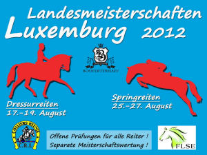 Die Landesmeisterschaften der Dressur- und Springreiter von Luxemburg finden dieses Jahr an zwei Wochenenden im August auf der sehr attraktiven Reitanlage Bouferterhaff in Bartringen statt (www.bouferterhaff.lu). Vom 17. Bis 19. August treffen sich die Dressurreiter, und vom 25. Bis 27. August stellen sich die Springreiter der Konkurrenz. Mit Unterstützung der FLSE (Féderation Luxembourgeoise des Sports Equestres) und des CRL (Cavaliers Réunis Luxembourgeois) als Co-Organisatoren, wird der Erfolg gesichert sein!