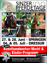 Die Reitanlage Birkenhof in Sinz steht am 27./28. Juni und 04./05. Juli wieder ganz im Zeichen des Reitsports und erstmalig des Kunsthandwerks. Reiter aus dem Saarland, Rheinland-Pfalz und Luxemburg treten bei Dressur- und Springprüfungen bis Klasse M auf den Außenreitplätzen an und bieten spannende Wettkämpfe. Neben dem Reitsportprogramm wird der Reit- und Fahrverein Dreiländereck auf der Reitanlage Birkenhof auch ein abwechslungsreiches Rahmenprogramm bieten.