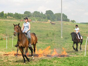 Qui na pas eu envie un jour de faire passer son cheval à travers un mur de feu après avoir vu une équipe de spectacle comme celle des Cavaliers-Voltigeurs du Bajutsu le réaliser ? Le cheval, animal-proie, réagit selon ses instincts. Ceux-ci lui fournissent des signaux dalerte aux abords dun éventuel danger, et cest la fuite (souvent en avant). Face au feu, le cheval a tendance à réagir de la même façon, et il fera tout ce qui est possible pour fuir dans le sens opposé. Sauf si vous lui avez appris à jouer avec le feu . 17.07.2004 Stage du Passage du Feu weiterlesen